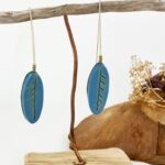 Long and sleek a blue leaf is subtlety stroked in green shimmer to expose the veins on it’s surface. The sterling silver and hand formed and embedded in the leaves to sway from your ears instead of doing the dangle dance all over!