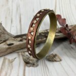 The metallic dark brown surface of this bangle bracelet is a foil for the underlying granite colored clay. Formed on a brass bracelet blank, the metals and stone are accented by tiny dots of granite in between the triangle peek holes across the top.